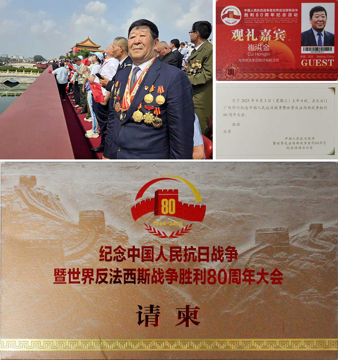 2025 9 3 日,天安门广场旌旗猎猎、号角嘹亮,中国人民抗日战争暨世界反法西斯战争胜利 80 周年阅兵式在此隆重举行。安达集团党委书记、董事长崔洪金作为全国最美拥军人物代表受邀出席,在现场见证这一彰显国威军威的历史性时刻