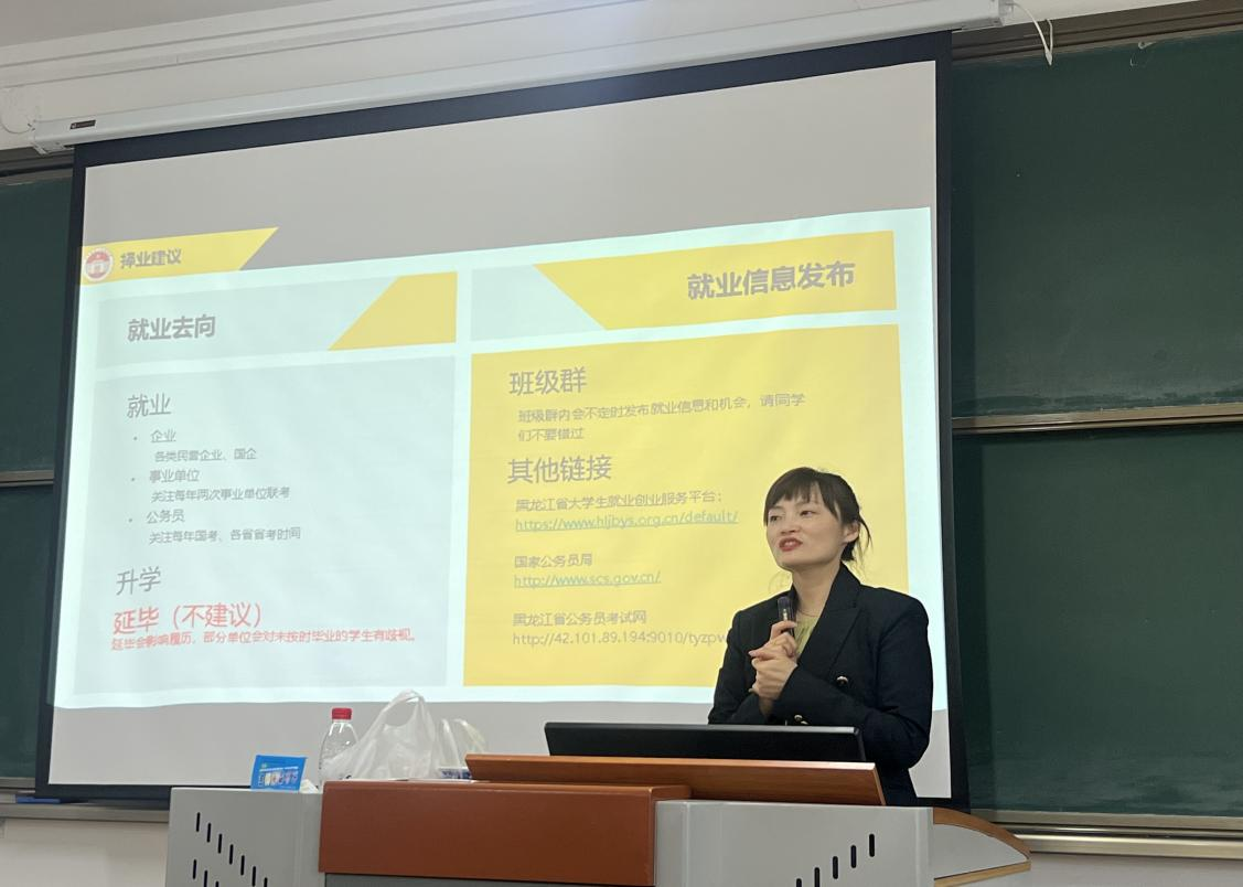讲座中,孙博老师围绕当前就业形势和就业创业服务平台的操作两大核心板块展开讲解。孙博老师深入剖析了择业的关键要素,结合当前就业形势,为同学们提供了实用的择业策略和有效的信息渠道,鼓励大家勇敢追求梦想,不畏挑战。随后,孙博老师围绕“黑龙江省就业工作平台”,耐心细致地讲解了“基本信息填写”“就业推荐表导出”“就业信息填报”“就业派遣”等模块的填报流程与注意事项。