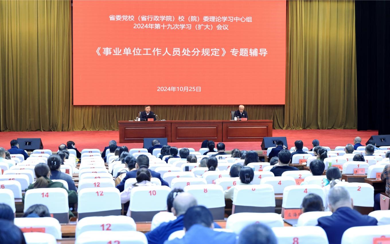为推进党纪学习教育常态化长效化,持之以恒学纪知纪明纪守纪,教育引导党员干部真正把纪律规矩转化为政治自觉、思想自觉、行动自觉,10月25日下午,省委党校(省行政学院)组织召开校(院)委理论学习中心组2024年第十九次学习(扩大)会议,专题学习《事业单位工作人员处分规定》,常务副校(院)长周英东主持会议并讲话,校(院)委理论学习中心组成员、二级巡视员、全体教职工参加会议。